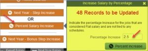To then increase the salaries based on a percentage increase, click on Percent Salary Increase. The system will tell you how many records will be updated. This is a reminder to make sure you have executed a search first.